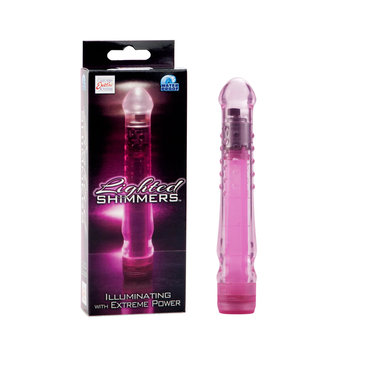 Vibrador Brillante Shimmers California Exotic. ¡Los Brillos Iluminados establecen el estado de ánimo apaga las luces, enciende las vibraciones y disfruta del espectáculo de luces! ¡Iluminando con extrema potencia! Los vibradores de alta velocidad elegantes, suaves y elegantes se iluminan con un brillante DISEÑO LED contorneado de forma única para una estimulación óptima. Sonda de forma semifálica con superficie irregular para una estimulación adicional.